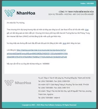 Bước 1: Hệ thống Customer Nhà Đăng Ký Nhân Hòa gửi mail tự động, nội dung mail chứa link đã được tạo để đăng ký