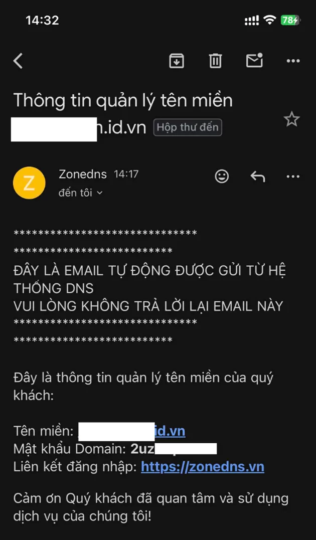 Bước 6: Sinh viên sẽ nhận được mail Thông tin quản trị tên miền ở trong mail của mình