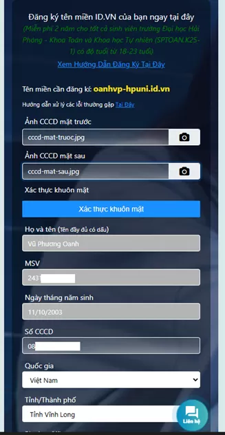 Ví dụ: oanhvp@hpuni.edu.vn hệ thống fill và fix cứng lại oanhpv-hpuni.id.vn ở form khung “Tên miền cần đăng ký”
